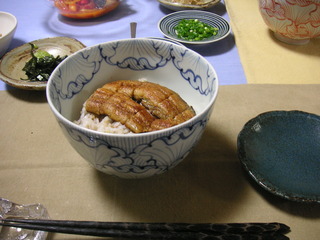 といってもこれもスーパーのうなぎ。テレビでいつか見た方法で、市販のものも、一度さっと湯通しして(えっと驚くかもしれないけどこれいいですよ)、キッチンペーパーで水気をおさえてから、フライパンに少量の油で皮目側を少し焼き、酒をふって2分ほど蒸し焼きする。ふっくらして美味しくいただけます。