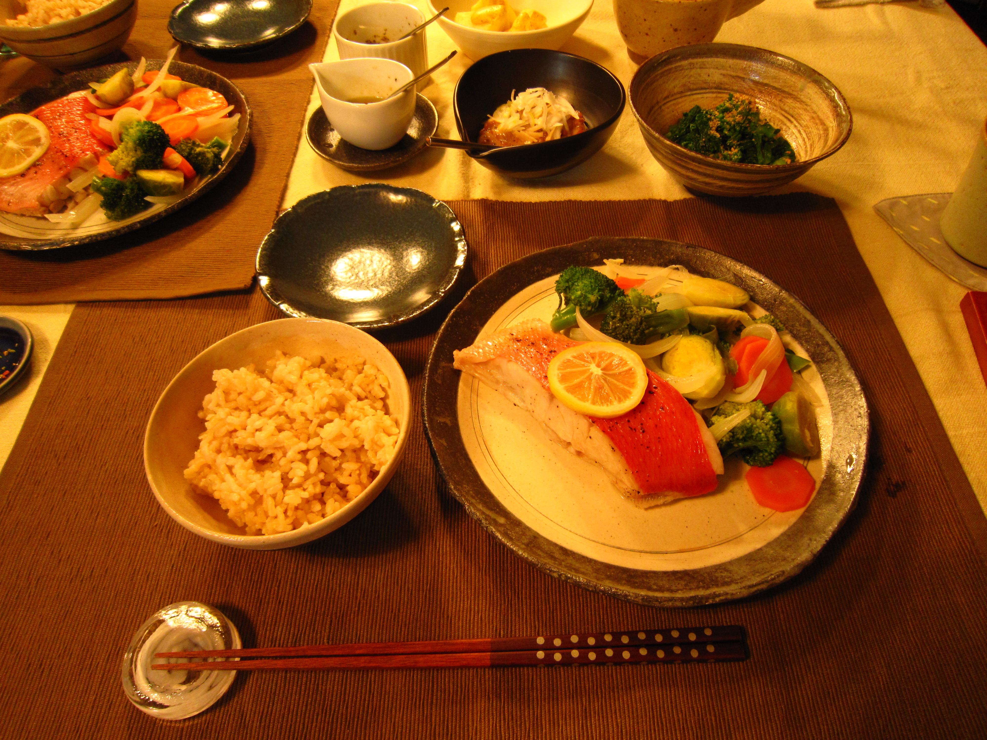オリーブオイルにしょうゆを合わせたのをちょっとかけて。玄米ご飯と休肝日。