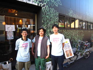 写真は劇場入り口にて。左から照明大野さん、音楽いとをさん、そして演出の大澤遊さん。