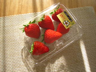 直売所のいちごを買ってみようと朝、出かけてみたら、大晦日だからもう売り切れたと言う。粒が揃ってないのが残ってひとつだけあるというのが、見たらこんなにきれいでした。わあい。残りものに福、あるかな。「大人食べ」で一パック、食べてやろう、というのが今夜のわたしのおたのしみなのだ! タキにも一個あげるよ。